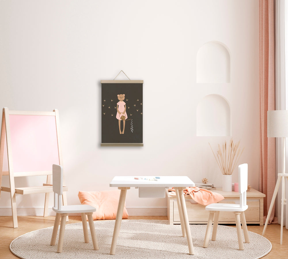 Kids' wall art, printed on canvas in a classic and timeless style, theme, and color palette. Designed to decorate children's or nursery rooms. Framed with wooden hanging hardware.